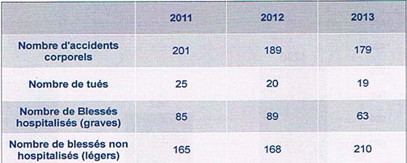 Comme au niveau national, les causes principales des 15 accidents mortels de la circulation de l’année 2013 sont : la vitesse dans 40 % des accidents et la conduite sous l’emprise de l’alcool ou de produits stupéfiants dans 26 % des accidents.
