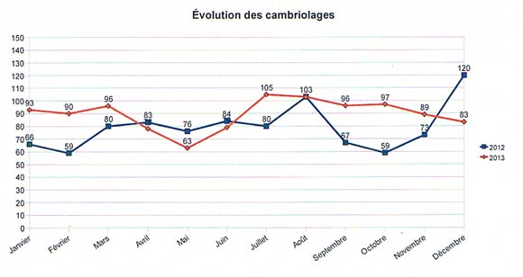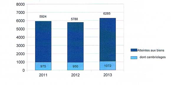 Les atteintes aux biens progressent de 8,59% (6285 faits constatés en 2013 contre 5788 faits constatés en 2012).