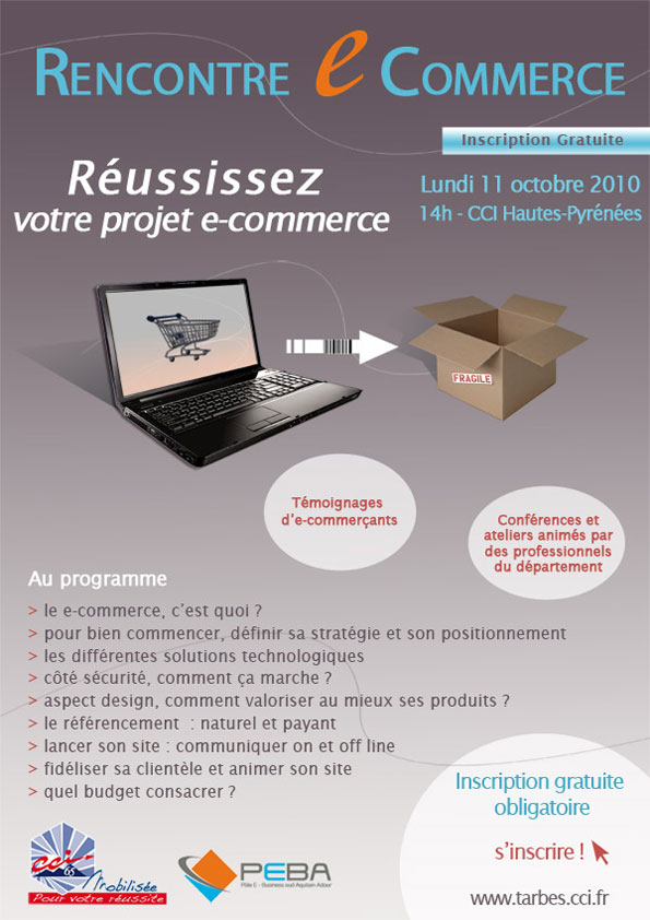 La Chambre de Commerce et d’Industrie des Hautes-Pyrénées les invite le 11 octobre à 14h à participer à la « Rencontre E-Commerce » organisée en partenariat avec le PEBA (Pôle E-Business sud Aquitain et Adour) pour profiter ainsi des conseils d’experts en la matière et de témoignages d’e-commerçants.