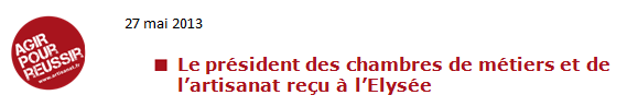 Au cours d’un entretien d’une heure lundi 27 mai, le président de l’Assemblée permanente des chambres de métiers et de l’artisanat, Alain Griset, a présenté au président de la République, François Hollande, la situation de l’artisanat dans tous ses aspects.