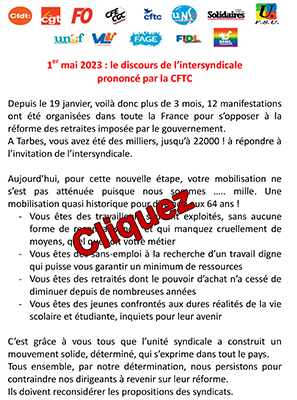 En ce 1er mai 2023, ce sont quelque 8000 personnes qui se sont mobilisées dans les rues de Tarbes selon l’intersyndicale (5000 selon les chiffres de la police) contre la réforme des retraites. Le départ a été donné aux alentours de 10 h devant la bourse du travail. Le discours de l’intersyndicale a été prononcé par le représentant de la CFTC.Le discours de l’intersyndicale