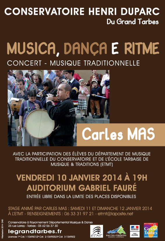 Le Conservatoire Henri Duparc du Grand Tarbes et l’Ecole Tarbaise de Musique et Traditions (ETMT) accueillent Carles MAS grand spécialiste de la musique traditionnelle pour un concert "Musica, Dança e Ritme" avec la participation des élèves du Département de Musique Traditionnelle du Conservatoire et de l’ETMT, le Vendredi 10 Janvier 2014 à 19h à l’Auditorium Gabriel Fauré.