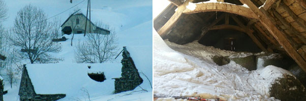 Même si une avalanche a traversé la route la semaine dernière et si le souffle a été ressenti jusqu’au camp Bernard Rollot sur l’autre versant de la vallée, les dégâts sur les granges ne se voient pas de la route. Il aura fallu l’œil averti des éleveurs de la vallée, par ailleurs dameurs, conducteurs de chasse neige ou moniteurs de ski, pour se rendre compte qu’une avalanche de poudreuses avait endommagé plusieurs bâtiments à Sourriche. Il s’agit d’une résidence secondaire (grange aménagée) appartenant à des Tarbais, deux granges à Noël Fourtine d’Esterre dont un pignon a été fortement endommagé, une grange à Jean-Pierre Prat de Viey et une à Denis Laporte de Viella. Les toits ont été emportés ou se sont effondrés totalement ou en partie.