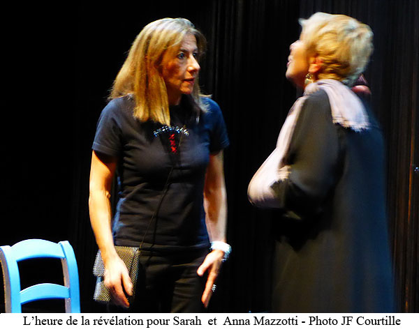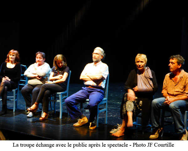 Après les salves d’applaudissements du public, un échange s’instaure entre l’auteure, le metteur en scène, les comédiens et les spectateurs. « Votre pièce est-elle inspirée d’une histoire vraie ? ». Gloria Carreno confie avoir été bouleversée par un récit entendu à la radio : celui de la nièce du criminel nazi Goering, qui avait choisi de ne jamais avoir d’enfant pour ne pas transmettre un nom maudit par l’histoire. « J’ai éprouvé ensuite le besoin d’écrire un texte autour de cette trame, pour explorer le parcours intérieur d’une personne qui endosse la culpabilité d’autres personnes ». Une spectatrice souligne la pertinence du choix scénographique. Mercedes Tormo raconte que le décor proposé par Eric Sanjou a permis d’évoquer avec simplicité le labyrinthe des pensées et des souvenirs de Betty. Elle précise aussi que le jeu de lumières sculpté par Dominique Prunier a facilité le dévoilement progressif du mystère. « Ce décor exprime ce que Boris Cyrulnik appelle ‘la résilience’, autrement dit la capacité d’un être humain à survivre, et à se renforcer après une épreuve ».