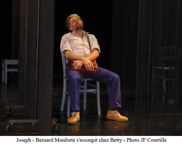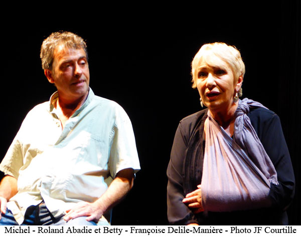 Autour du personnage central de Betty, interprété avec flamme par Françoise Delile-Manière, gravitent en premier lieu des personnages masculins, en apparence, burlesques. Roland Abadie et Bernard Monforte apportent leur dynamisme et leur fantaisie à Michel et Joseph, chevaliers servants d’une Betty soucieuse de dissimuler ses secrets. L’accident de la route qui frappe Joseph change brutalement la donne. Le passé de Betty remonte à la surface sous les yeux de Michel, avant l’irruption de Sarah, la nièce de Joseph, dont le rôle est assuré avec brio par Anna Mazzotti. Au fur et à mesure que les panneaux disparaissent et que la lumière grandit, Betty dévoile son terrible secret familial à Michel et Sarah médusés. La pièce s’achève sur le geste fraternel de Betty et Sarah : la fille du bourreau et la fille des victimes choisissent d’inventer ensemble un avenir où la fête redevient possible …