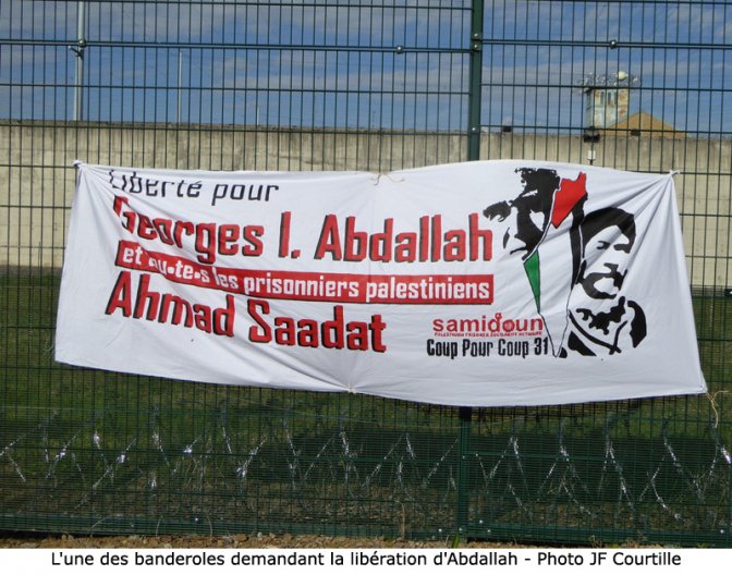 Devant les hautes grilles qui entourent la Centrale de Lannemezan, dans les Hautes-Pyrénées, près de 500 personnes sont rassemblées ce samedi 22 octobre 2016. Les banderoles colorées à l’effigie de Georges Ibrahim Abdallah ont été disposées sur plusieurs dizaines de mètres autour de l’enceinte. Elles côtoient d’autres messages qui appellent à la libération des prisonniers basques. Devant l’entrée de la prison, les orateurs se succèdent, maniant à tour de rôle le français, l’anglais ou l’arabe. Par intervalles, la foule reprend en chœur le cri qui explique sa présence, dans cet endroit perdu à un kilomètre d’une ligne de chemin de fer : « libérez Abdallah ! ». Quelques fumigènes explosent de temps à autres, sous le regard placide de jeunes manifestants assis sur l’herbe. La scène a des allures de festival ou de rendez-vous des zadistes.