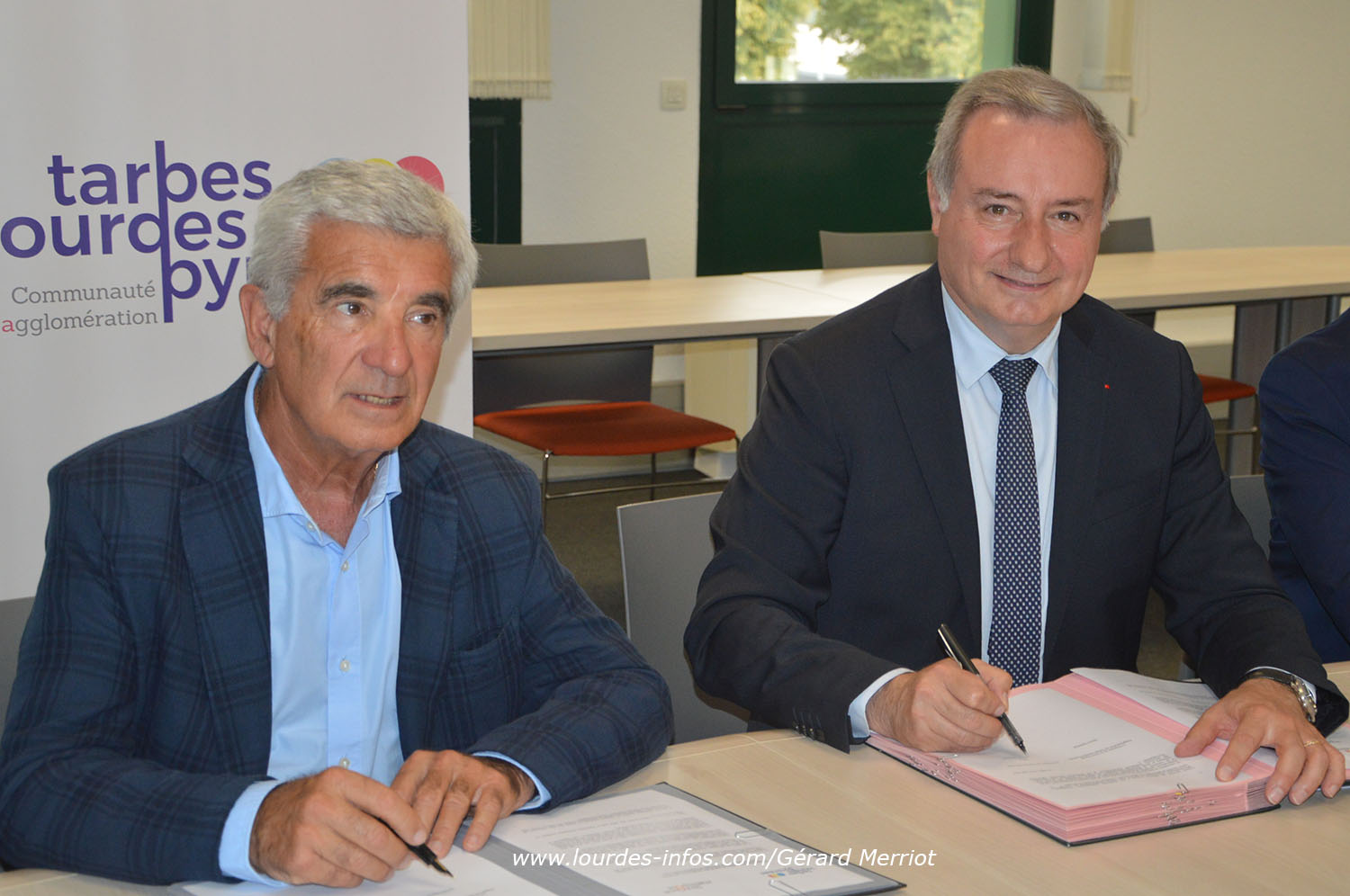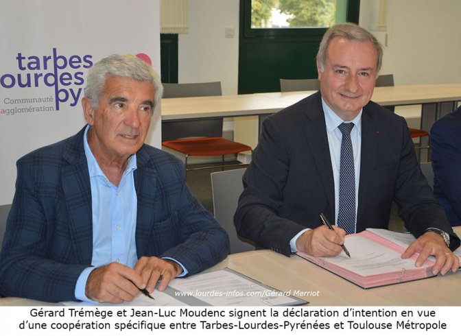 Ce vendredi après-midi, au siège de la Communauté d’agglomération Tarbes-Lourdes-Pyrénées, à Juillan, Gérard Trémège, président de la Communauté d’agglomération Tarbes-Lourdes-Pyrénées et Jean-Luc Moudenc, président de Toulouse Métropole, ont signé une déclaration d’intention marquant la volonté des deux signataires de mettre en oeuvre, sous la forme d’un contrat de partenariat à conclure d’ici la fin de l’année 2018, ce dialogue et ce mode de coopération nouveau et original.