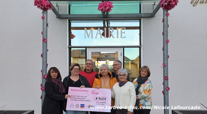 Ce 8 novembre, les acteurs de cette manifestation étaient réunis à la mairie pour remettre à Annette Cuq, la présidente de la ligue contre le cancer des Hautes Pyrénées, le chèque des fonds récoltés lors de la "Rand ‘Aureilhan en Rose" qui s’élèvent à 4962€.