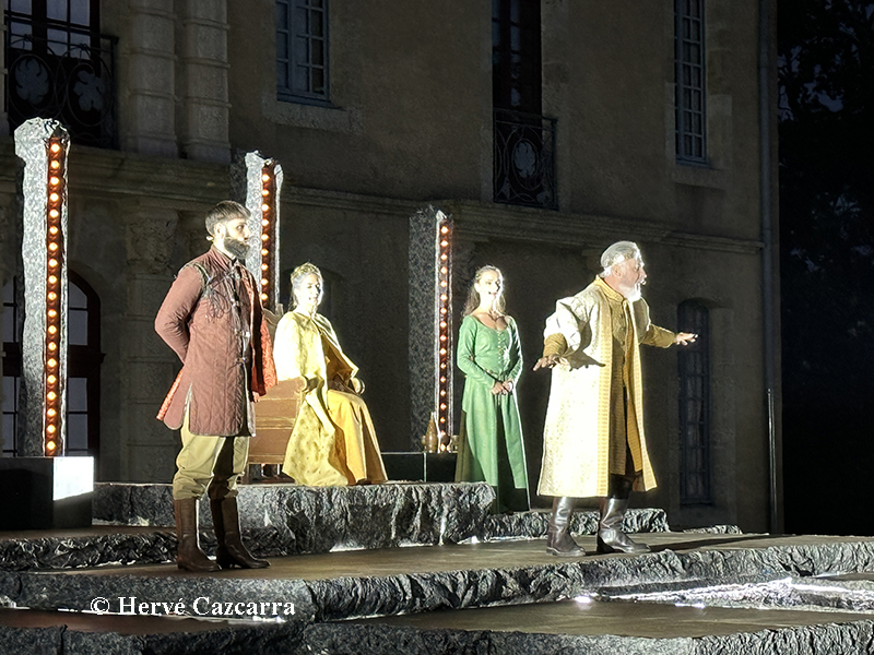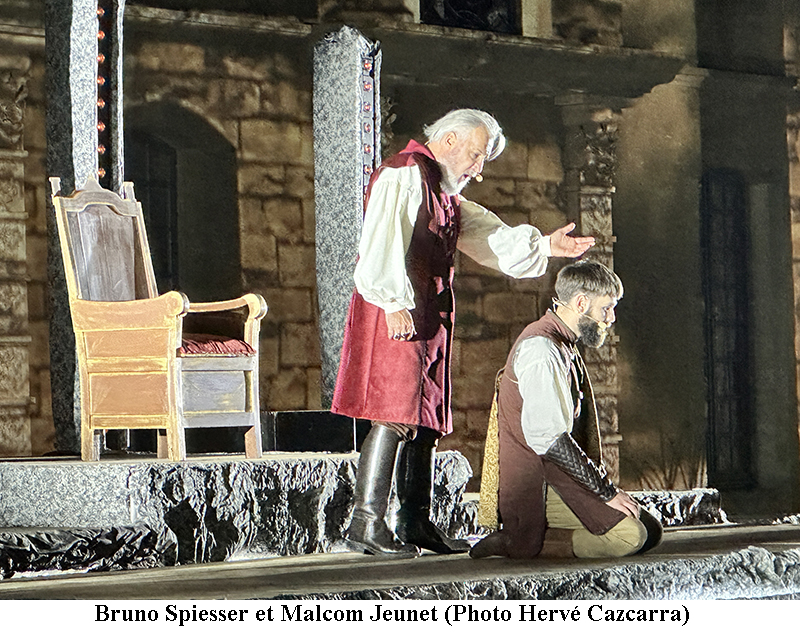 Première réussie à Château Montus avec les quatre cents places prises d’assaut et un public ravi et conquis par « Le Prince Noir », un somptueux spectacle « son et lumière ». Pour la troisième fois le duo Garces-Spiesser a cartonné à Château Montus avec un texte ciselé et une mise en scène au cordeau de Frédéric Garces et un Bruno Spiesser habité par le rôle du roi Edouard III d’Angleterre. Un texte servi par les interprétations magistrales de Jennifer Rihouey, dans le rôle de l’épouse royale et mère protectrice d’Edouard de Woodstock, de Fiona Petot, dans celui de Jeanne de Kent l’épouse du Prince par qui arrive le drame, de Malcom Jeunet, dans la peau de l’impétueux Capitaine de la Garde Bernard de Brocas qui trahi son Prince et ami par jalousie. Enfin Frédéric Garces incarne un Prince Noir tourmenté, partagé par son amour pour Jeanne et son goût de la Guerre. Une fois encore, la mise en scène ingénieuse, la force du texte et des interprétations, ont été sublimés par les projections d’images sur la façade du Château avec à la manœuvre Médéric Grandet (vidéo et mapping), Julien Jean-Jean et Laurent Aranda (son et lumière). Sans oublier les superbes costumes entièrement confectionnés par Caroline Laroche et Camille Motte qui, accessoirement partagent la scène comme dames de compagnie. A noter la participation du coursier royal Savana et d’Eric Préchac dans le rôle du palefrenier.