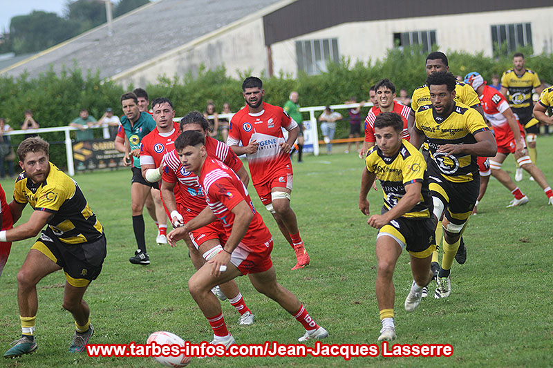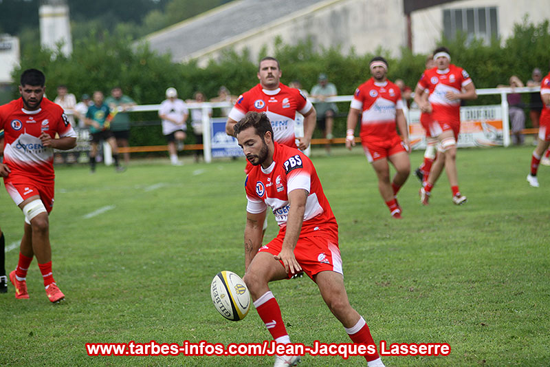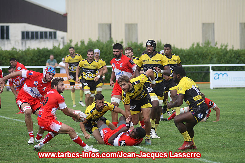 De son côté le staff bigourdan alignait un pack jeune avec Baratgin (22 ans), Montfort (20 ans), Turban (20 ans), Bibiena (20 ans), sans compter Estaque (22 ans), Peytavi (22 ans), Abadie (21ans) dans un Groupe rajeuni avec Bousquet (18 ans), Cellier (20 ans), Lhomme (21 ans), Perez (21 ans)… Un Groupe jeune mais mort de faim qui a renouvelé sa prestation contre Langon, au niveau de l’envie, de l’engagement, de la volonté d’avancer ensemble et de ne rien lâcher. Un Groupe qui n’hésite pas à jouer tous les ballons de conquête ou de récupération avec beaucoup de vitesse. Si les Tarbais, ont eu leurs ballons en touche, la mêlée sous pression et souvent pénalisée n’a pas permis de bons lancements de jeu, contrairement à Langon où les mêlées n’étaient pas disputées. Par contre les Bigourdans se sont nourris de ballons de récupérations dans les rucks ou de ballons relâchés au contact. Car la défense tarbaise, très agressive, est à mettre une nouvelle fois en exergue même si elle s’est fait surprendre parfois tout en colmatant les brèches. Bonne défense aussi sur les ballons portés dont ont abusé les Albigeois même s’ils ont marqué deux essais en percussions.