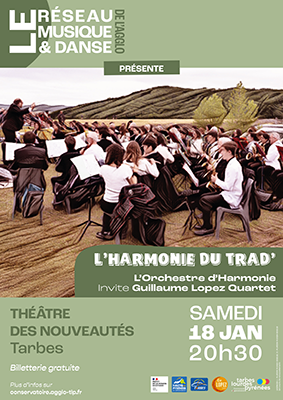Le 18 janvier prochain, l’Orchestre d’Harmonie sera sur scène aux côtés de Guillaume Lopez, à la découverte de son univers et du répertoire de la musique et des chants traditionnels. Dans ce projet, les 60 musiciens dirigés par Cédric Cieutat dialoguent avec le chant, la flûte, les cornemuses, l’accordéon diatonique et le clarin.