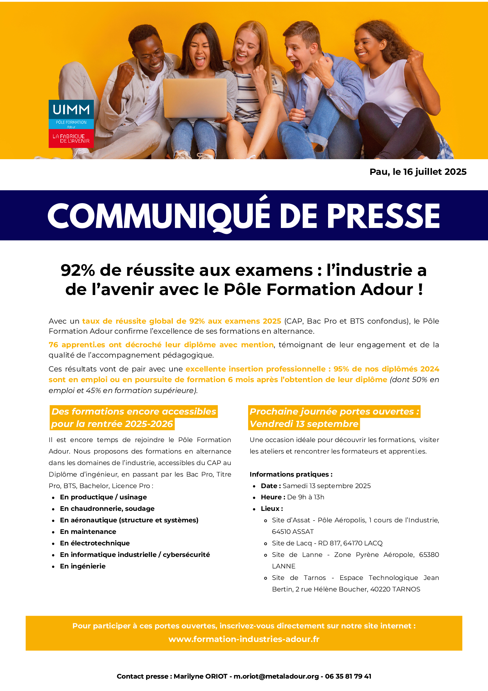 L’industrie se forme et se transforme avec le Pôle Formation Adour, qui signe une année exceptionnelle : 92% de taux de réussite aux examens (CAP, Bac Pro, BTS). Une performance qui illustre la qualité de l’accompagnement pédagogique et l’engagement des apprenti·es, dont 76 ont obtenu leur diplôme avec mention.