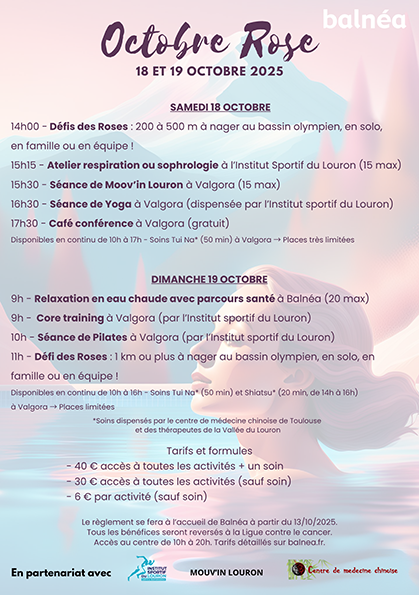 Balnéa, centre de bien-être emblématique de la vallée du Louron, renouvelle son engagement pour Octobre Rose les 18 et 19 octobre 2025. Après une première édition saluée en 2024, l’établissement propose un week-end alliant détente, sport et solidarité, au profit de la Ligue contre le cancer.