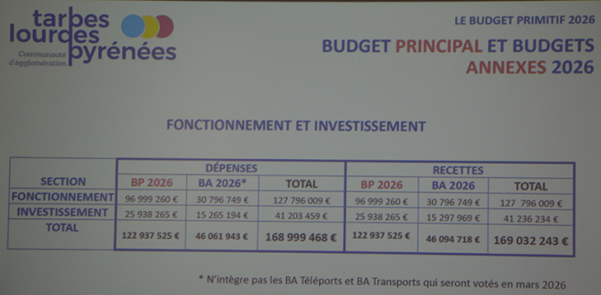 Réuni le 15 janvier 2026, le Conseil communautaire de la Communauté d’agglomération Tarbes-Lourdes-Pyrénées a examiné et débattu le budget primitif 2026 du budget principal, présenté par le rapporteur Yannick Boubée. Ce budget, construit dans la continuité du Débat d’Orientation Budgétaire du 4 décembre 2025, s’équilibre en dépenses et en recettes à 122 937 525 €.