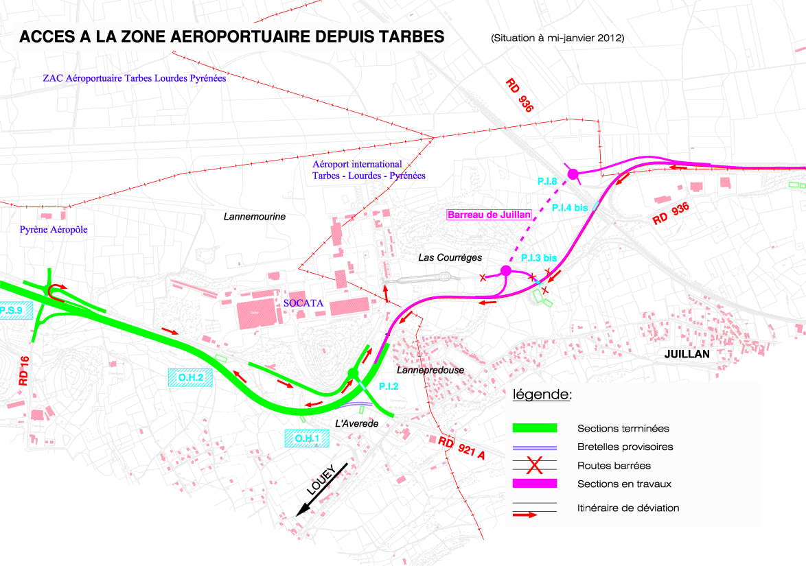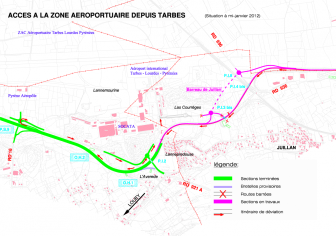 A partir du mercredi 11 janvier prochain, la bretelle de sortie en direction de la zone aéroportuaire sera supprimée . Les usagers en provenance de TARBES , pour accéder à l’aéroport, emprunteront un itinéraire de déviation par le giratoire de Pyrène Aéropôle (voir