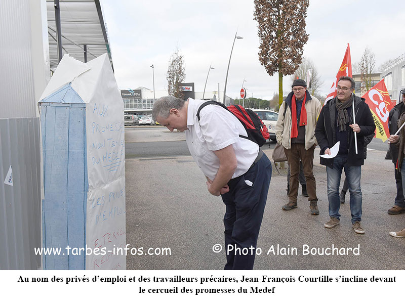 7 février 2019, par rédactionHier matin, chemin d’Azereix, devant le pôle de formation de la CCI, qui abrite le siège du Medef et de l’Union des entreprises de France, une délégation du Comité CGT 65 des Privés d’emploi et Travailleurs précaires s’est rassemblée pour procéder à l’enterrement symbolique des promesses du Medef qui n’ont pas été tenues. (...)