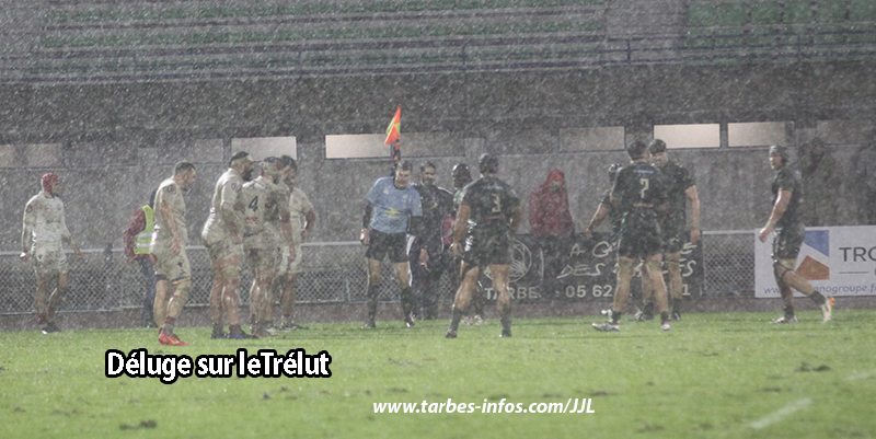 Sous une pluie battante, intercalée d’averses de grêle et d’un vent violent, les Tarbais qui ont dominé l’ensemble de la partie n’ont pas su ou pas pu concrétiser leur domination lors d’une première mi-temps pratiquement à sens unique. La défaite est d’autant plus cruelle qu’elle intervient à neuf minutes de la fin du temps règlementaire sur une pénalité au point de chute et un carton jaune à Van de Ven pour un placage à retardement dans les 22 mètres adverses. Un match de Phase Retour qui est une copie conforme des matchs de la Phase Aller. Avec de gros temps forts qui ne sont pas concrétisés, des mauvais choix, des fautes bêtes et un arbitrage incohérent qui siffle ou non les mêmes fautes selon le côté. Les Dieux du rugby, une fois de plus n’étaient pas du côté bigourdan avec deux essais refusés (27ème, 53ème) et deux pénalités manquées (31ème, 51ème). Une fois encore, les Tarbais n’ont rien à se reprocher du côté de l’engagement et de l’envie mais comme à l’accoutumée ils ont laissé passer trop d’occasions de scorer. Notamment sur cette pénalité décalée (21ème) jouée à la main avec en-avant au lieu de prendre les points au pied et de concrétiser deux temps forts de suite (12ème, 18ème).(...)