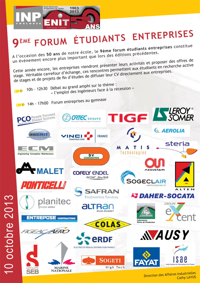La Direction des Affaires Industrielles de l’Ecole Nationale d’Ingénieurs de Tarbes organise le jeudi 10 octobre 2013 son 9ème forum étudiants / entreprises.