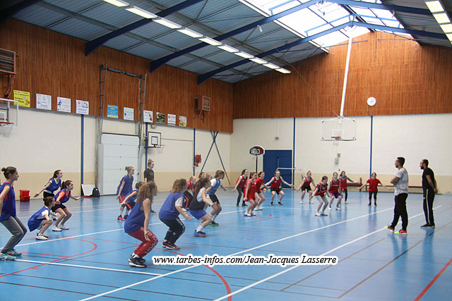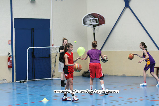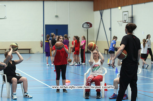 Comment progresser au basket en étant entraîné par des coachs qualifiés et des joueuses professionnelles qui sont issus de grands clubs, tout en participant à une action humanitaire au bénéfice d’autres enfants. C’est le pari réussi par l’Association ’’Ballon du Bonheur’’ qui a organisé deux stages (Training Camp) de deux jours, destinés aux Mini Poussin/Poussin et aux Benjamin/Minime Filles, dans la Salle Polyvalente du Bouscarret à Maubourguet du 20 au 24 avril. Le SOM Basket et la Municipalité de Maubourguet, dont le Maire Jean Nadal est un fidèle supporter du TGB, ont mis gracieusement les installations sportives à la disposition de l’Association. Deux groupes de 30 enfants venus d’Aureilhan, de Juillan, de Laloubère, de Lembeye, de Maubourguet, de Pontacq et du TGB, ont travaillé les bases du basket sous l’égide de Joyce Cousseins-Smith, de Sabrina Reghaissia, de Sofiane et Samir Sebaay (Entraîneur Région Poussins et Minimes, Coachs équipe fanion Fille et Garçons à Salies du Salat) et de Yannick Sachée (joueur de l’UTLB). Les frais d’inscription serviront à conduire des actions humanitaires et la construction de puits à Madagascar. Joyce a mis en place, au delà des exercices classiques, des exercices ludiques qui utilisent en même temps un ballon de basket et une balle de tennis ou une baudruche. Des exercices venus des Etats-Unis, qui développent la technique individuelle et la coordination. Cathy Lafeuillade (Présidente du SOM Basket) et Magalie Cabé (Responsable des Minimes de Pontacq) ont assisté à ces séances et ont été conquises par le travail réalisé. Un plus par rapport au travail réalisé en club, avec plus d’application compte tenu que les exercices sont dirigés par des joueuses qu’elles admirent. Des stages qui sont ouverts à toutes les jeunes licenciées sans notion de niveau mais aussi des sélectionnées départementales, comme Lucie et Lucille (SOM) ou Manon (Juillan), qui ont énormément appris au cours des deux jours.