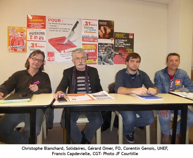 « Si cette loi El Khomri est adoptée, nous ne reviendrons pas au XIXème siècle, mais au temps des « Seigneurs » et de la féodalité ». Lors de leur conférence de presse intersyndicale, vendredi dernier à la Bourse du Travail de Tarbes, les responsables de Solidaires, de la CGT, de FO et de l’UNEF, auxquels la FSU, absente, avait confirmé son soutien, ont lancé un cri d’alarme. Ils ont appelé à « un grand rassemblement des salariés, des fonctionnaires, des demandeurs d’emploi, des travailleurs précaires, des étudiants, des lycéens et des retraités, jeudi 31 mars à 10h30, devant la Bourse du Travail, pour défiler dans les rues de Tarbes jusqu’à la Préfecture ».