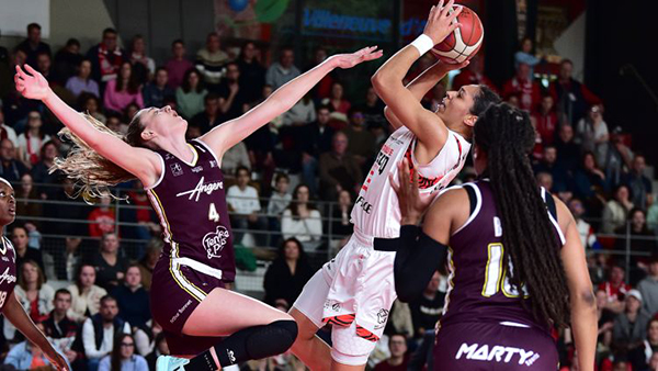 L’ESBVA-LM, le leader de la saison régulière de LFB, a confirmé son statut en remportant le match Retour contre Angers sur le score de 100-91, après avoir déjà triomphé lors du match Aller avec un score de 82-73. Le match, joué à domicile, revêtait un caractère spécial puisqu’il marquait la dernière apparition de Kennedy Burke sous les couleurs de l’équipe avant son départ pour la WNBA. Le début de la rencontre a été tendu, les visiteurs jouaient les trouble-fêtes en prenant l’avantage (24-29, 10ème). Cependant, les « Guerrières » de l’ESBVA-LM ont rapidement repris les rênes du jeu dans le deuxième quart-temps, surclassant leurs adversaires avec un impressionnant 25-12, renversant ainsi le score à leur avantage à la mi-temps (49-41, mi-temps). Le troisième quart-temps a vu une bataille plus équilibrée, avec les adversaires répondant presque coup pour coup, mais l’ESBVA-LM a réussi à garder une petite avance, porté par son incroyable force collective (4 joueuses à + de 20 d’évaluation). Dans le dernier acte, les Guerrières ont accentué leur domination en marquant 30 points contre 27 pour leurs adversaires, scellant ainsi la victoire avec une marge confortable. La performance remarquable de cette équipe, en particulier lors des moments cruciaux du match, a assuré une sortie triomphante pour Kennedy Burke, qui a ainsi pu célébrer sa dernière avec une victoire significative (100-91, score final/ 182-164 au cumulé).