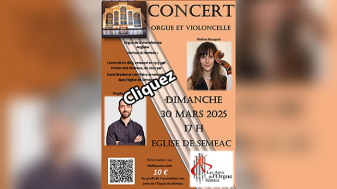 Le dimanche 30 mars à 17h00, à l’Eglise de l’Assomption de Séméac, Mélina Rouquié et Virgile Monin vous offriront un concert exceptionnel d’orgue et de violoncelle. Cet événement est organisé au profit de l’association des Amis de l’Orgue de Séméac, qui travaille avec passion pour l’installation d’un orgue dans cette commune des Hautes-Pyrénées, proche de Tarbes. Ce projet ambitieux, sur le point de se concrétiser, enrichira bientôt le patrimoine instrumental local grâce à l’arrivée d’un orgue anglais unique.