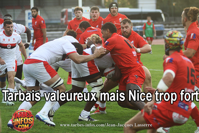 Les Tarbais toujours pénalisés mais pas résignés résistaient sur leur ligne à un gros temps de jeu niçois (44ème) avant d’encaisser un essai d’Ortolan suite à une chistera et à un demi-tour sur lui-même qui surprenait la défense 6-28 (51ème). Un superbe 50/22 de Descoubet ne donnait rien avec un ballon perdu en touche (54ème). Nice marquait un bel essai en première main derrière une mêlée avec le demi-de-mêlée remplaçant Gimbert à la conclusion 6-35 (62ème). Les Tarbais tentaient de sauver l’honneur en vain malgré une attaque qui balayait le terrain sur 80 mètres (76ème). Pire ils encaissaient un sixième essai derrière une nouvelle pénalité par le troisième ligne Berendel (80ème). Un score lourd, très lourd, pour des Tarbais courageux mais dépassés par des Niçois supérieurs à tous les postes. Pire le pilier Da Cunha, le troisième ligne Saint-Guilhem, le demi-de-mêlée Millet, sont sortis sur blessure et Cellier a pris un carton rouge.