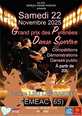 Le samedi 22 novembre à 20h, le Centre Léo Lagrange de Séméac devient le théâtre d’un spectacle exceptionnel : le Grand Prix des Pyrénées de danse sportive. Organisé par l’association Séméac Danse Passion, affiliée à la Fédération des Sports de Danse, cet événement inédit dans la région réunit des couples venus d’Espagne, d’Italie, du Portugal, du Royaume-Uni et de France pour une compétition de haut niveau.