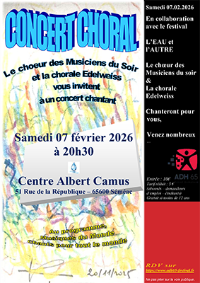 Le Centre Albert Camus de Séméac accueillera, le samedi 7 février 2026 à 20h30, un concert choral réunissant le Chœur des Musiciens du Soir et la chorale Edelweiss. Cette soirée s’inscrit dans le cadre du festival L’EAU ET L’AUTRE, qui met en lumière des initiatives artistiques ouvertes sur le partage, la rencontre et la diversité culturelle.