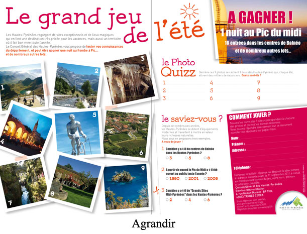 Aussi, le Conseil Général propose au grand public, habitants des Hautes-Pyrénées ou visiteurs occasionnels, de tester ses connaissances du département. Les participants sont invités à reconnaître, derrière 9 photos, les sites des Hautes-Pyrénées qui, chaque année, attirent des milliers de visiteurs.