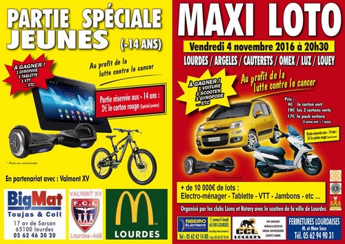 Pour la 32ème fois, les Lions Club et les Rotary de Lourdes et d’Argelès Vallée des Gaves organisent, le vendredi 4 novembre 2016, à 20h30, un MAXI LOTO au profit de la recherche contre le Cancer. Le but est d’offrir des fonds à la lutte contre le cancer 65 (Ligue départementale de Lutte contre le Cancer présidée par le docteur Bernard Couderc ainsi qu’à Lourdes Cancer Espérance, association présidée par Marie-Claude Aizpurua) pour acheter du matériel, apporter une aide financière pour des situations difficiles suite à la maladie etc.(...)