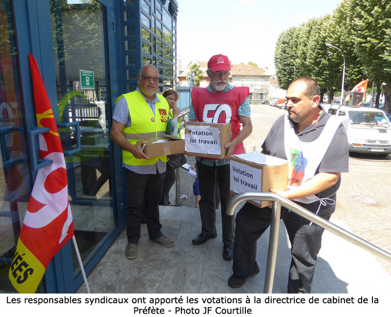 Plus de 1000 personnes, 1700 selon les syndicats, ont défilé dans les rues de Tarbes ce mardi 28 juin 2016, à l’appel de la CGT, de FO, de FSU et de Solidaires, pour demander le retrait du projet de loi « Travail », qui doit être voté aujourd’hui par le Sénat. Les manifestants ont défilé entre la Bourse du Travail et la Préfecture, en passant par la place de Verdun et l’Hôtel du Département, où des discussions ont lieu sur l’organisation du temps de travail des agents territoriaux. Les responsables des syndicats ont apporté les 5214 « votations citoyennes », recueillies dans les Hautes-Pyrénées en juin, à la Directrice de cabinet de la Préfète des Hautes-Pyrénées. La manifestation s’est achevée par un pique-nique sous les arbres du parvis de la Préfecture. Les syndicats attendent désormais les résultats du vote au Sénat et les échos de la rencontre des confédérations avec le Premier Ministre.