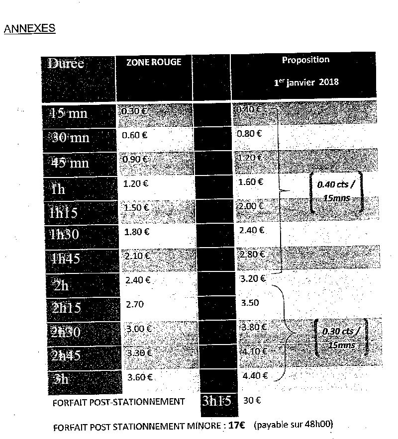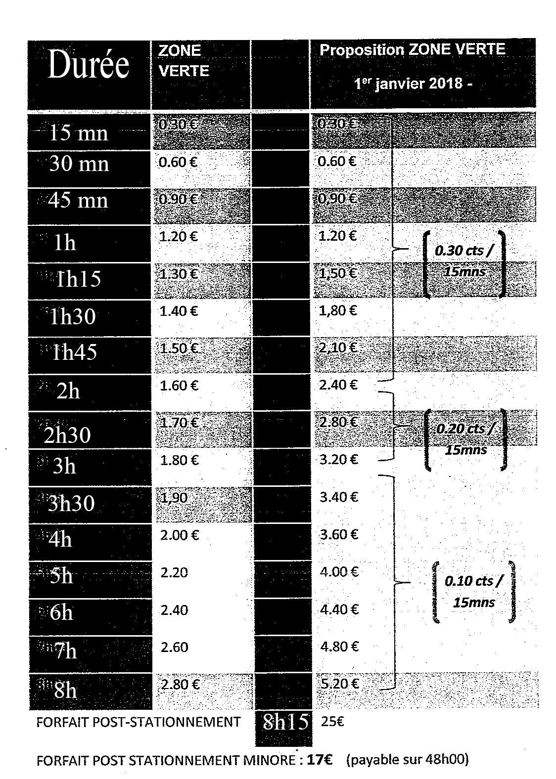 Il est donc proposé de modifier la structure tarifaire des zones rouges et vertes et de créer un quart d’heure supplémentaire correspondant à la valeur du forfait post stationnement qui serait, afin d’être dissuasif, fortement valorisé (cf. ANNEXE).