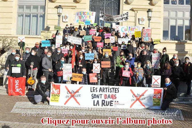 150 à 200 personnes du monde de la Culture ont manifesté ce mardi matin à Tarbes, suite à un appel national. « Nous voulons travailler ! », tel était le leitmotiv que l’on pouvait entendre, dès 10 h, aux abords de la halle Brauhauban pour le défilé des contradictions. A 11h, le cortège s’est déplacé jusqu’à la place Jean Jaurès, au pied de la mairie.