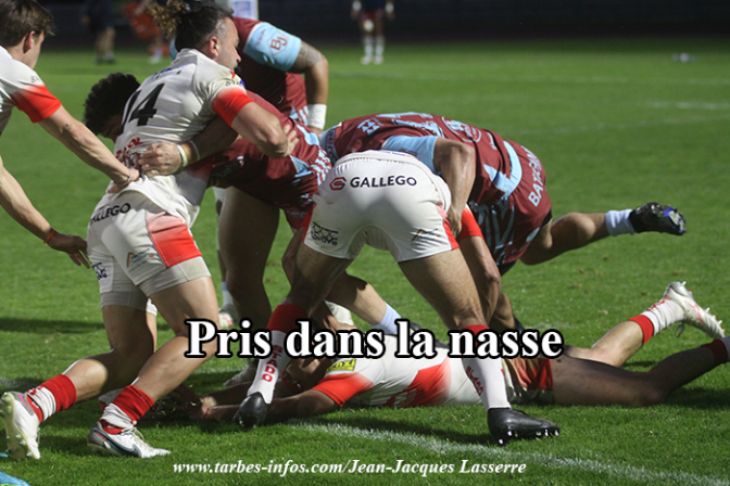 A la reprise l’arrière Bouet depuis ses 22 mètres trouvait une touche dans les 22 mètres tarbais et Bourgoin récupérait le lancer. Après un ballon porté, les avants berjalliens enchainaient et après plusieurs percussions le puissant N° 8 Luafutu marquait un essai transformé par Cachet 9-24 (44ème). Le staff bigourdan faisait rentrer du sang neuf et Tarbes enchainait les temps de jeu face à une défense agressive et hermétique qui défendait âprement sa ligne. Les Tarbais obtenaient une pénalité mais perdaient le ballon sur la pénaltouche à 5 mètres (49ème). Les Tarbais gâchaient plusieurs occasions (51ème, 53ème, 55ème, 57ème, 60ème, 63ème) et finalement ils trouvaient la faille sur un ballon récupéré par Soufflet dans un ruck dans ses 40 mètres. Dolier poursuivait et redonnait à Cellier qui envoyait Latorre à l’essai, transformé par Pialot 16-24 (68ème). Plus rien ne sera marqué malgré des tentatives des deux côtés et de nouvelles approximations tarbaises.
