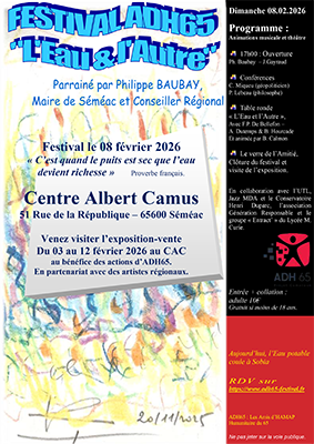 En parallèle, une exposition-vente sera proposée jusqu’au 12 février, au bénéfice des actions humanitaires d’ADH65, notamment en faveur de l’accès à l’eau potable pour les populations, comme à Sobia au Cameroun.