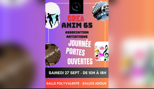 Vous aimez chanter, danser, jouer la comédie, faire du cinéma, participer à des jeux en famille et des animations ludiques, et bien allez faire un tour le 27 septembre du côté de Salles Adour ! L’association CREA ANIM 65 ouvre ses portes ce jour-là de 10h à 18h. Plusieurs ateliers seront organisés et ouverts au public pour apprendre, essayer et s’amuser.