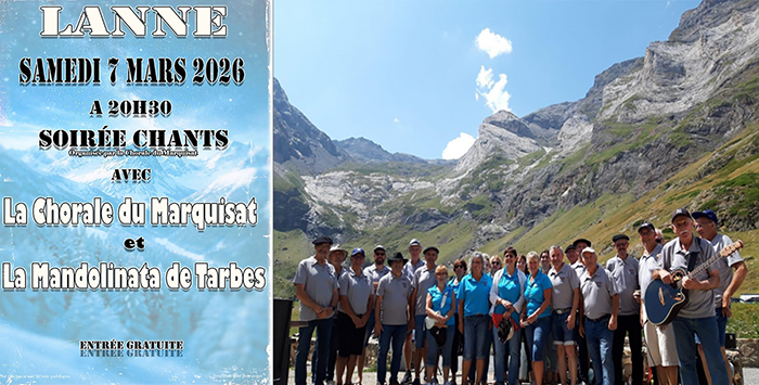 Samedi 7 mars la chorale du Marquisat organise la traditionnelle soirée chants à Lanne à 20h30 à la salle des fêtes. La Mandolinata de Tarbes, un des plus anciens groupes tarbais associe musiciens et ensemble vocal à quatre voix est invité à venir chanter ce soir-là dans une ambiance de partage et de convivialité. Un répertoire varié : chants pyrénéens, basques et d’ailleurs. Une soirée qui s’annonce agréable et joyeuse. Le meilleur accueil vous sera réservé. Entrée gratuite.